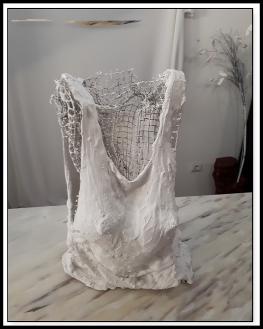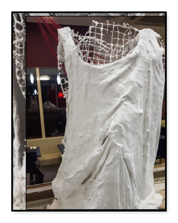 Ao visualizar esta rede tive a visão dum torso feminino, vestido duma forma fresca e moderna. Com recurso a um T-shirt dei forma à ideia, usando gesso para criar a peça.