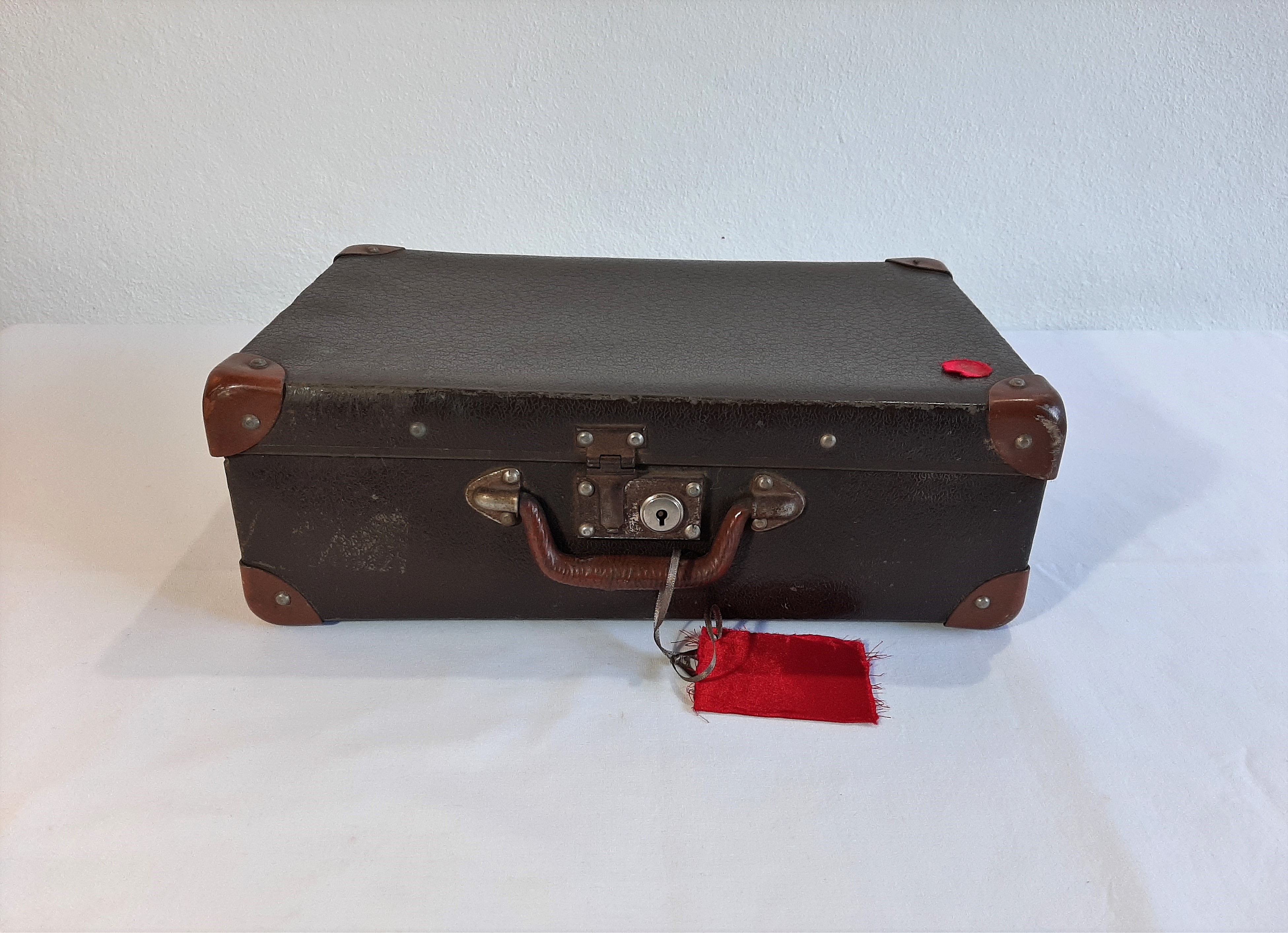 | E a Vida Continuará | 36cmx23cmx12cm | Gesso, Latex, Metal, Tecido de Cetim, Mala de Couro |