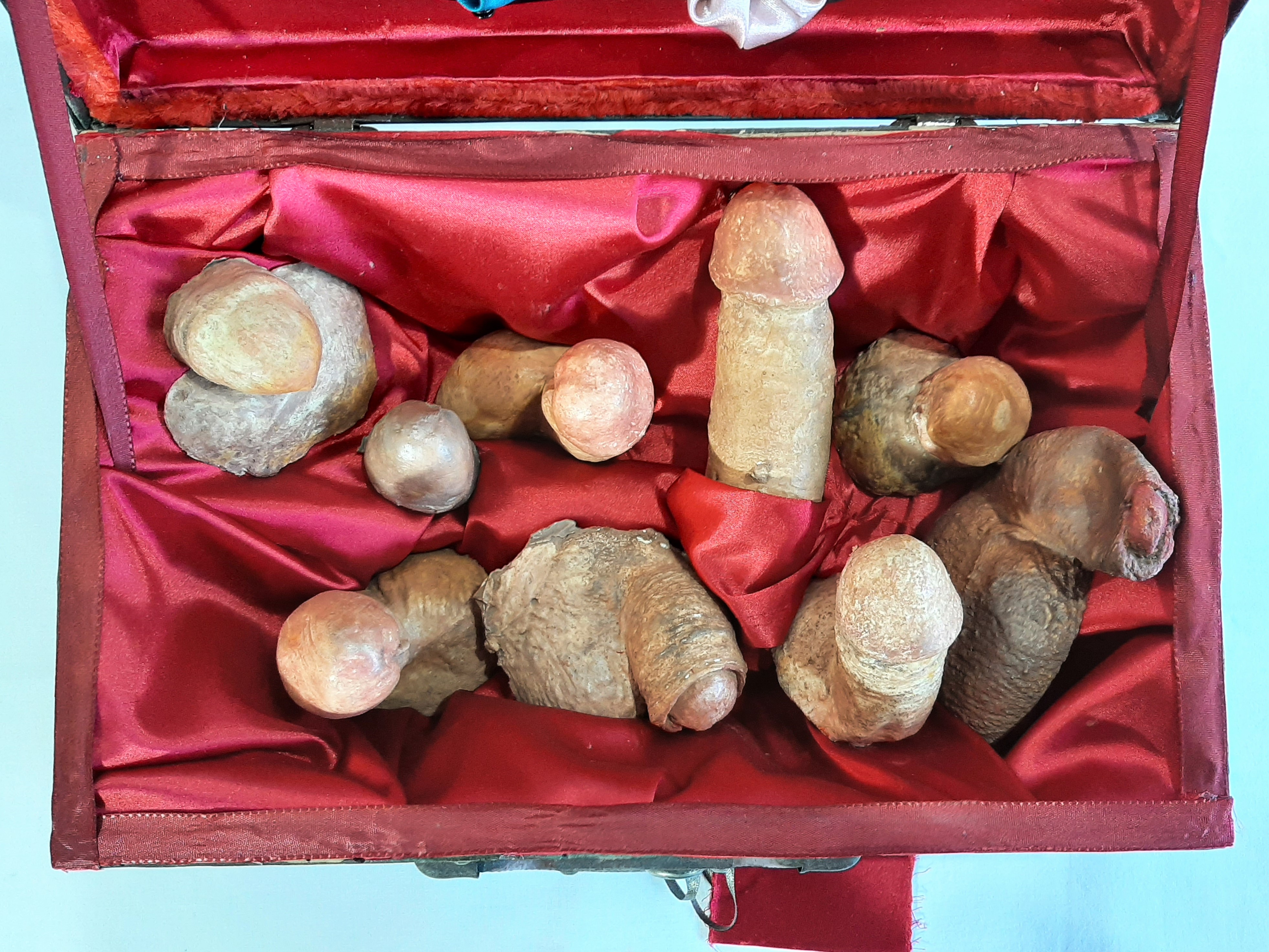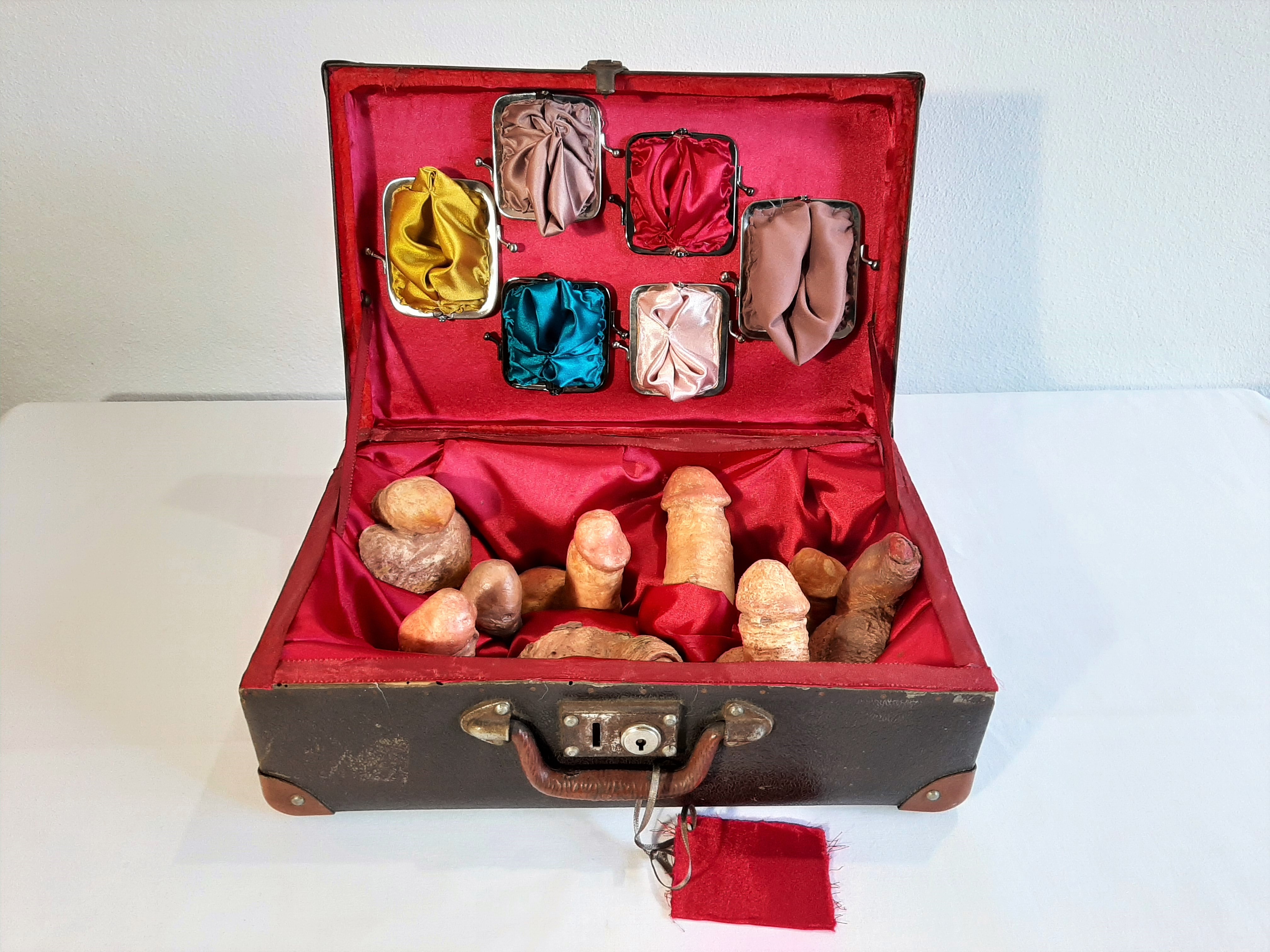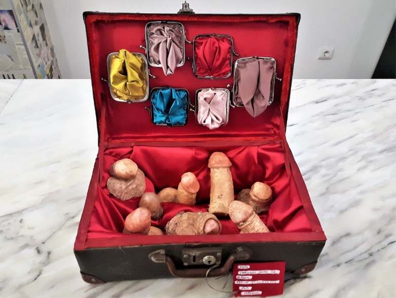 Levar na bagagem a capacidade reprodutiva! As excitações despertadas pela percepção das emoções surgidas num frente a frente tão habitualmente envergonhado, mas afinal tão natural e porque não, desenvergonhado! Pensei e criei uma mala de viagem onde estivessem presentes os dois elementos necessários à reprodução da raça. Decidi representá-la por um conjunto de pénis e vaginas, representando ambos os sexos e, portanto, a origem, reprodução e consequentemente, a continuação da raça, arrumados numa mala de viagem que pudesse percorrer mundo e ser mostrada sem que fosse necessário nada mais que não a sua simples abertura. Técnica - Moldagem, Caracterização, Costura