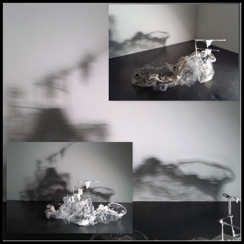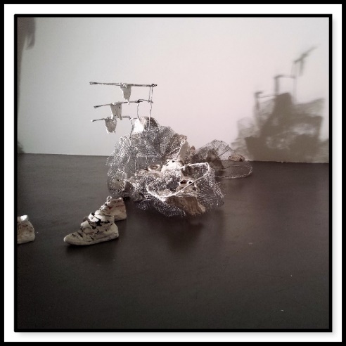 | ENSAIO | 380cmx60cmx85cm | Rede, Arame, Gesso, Ligaduras, Tecidos, Sapatos velhos e Tecido (reutilização de materiais) |