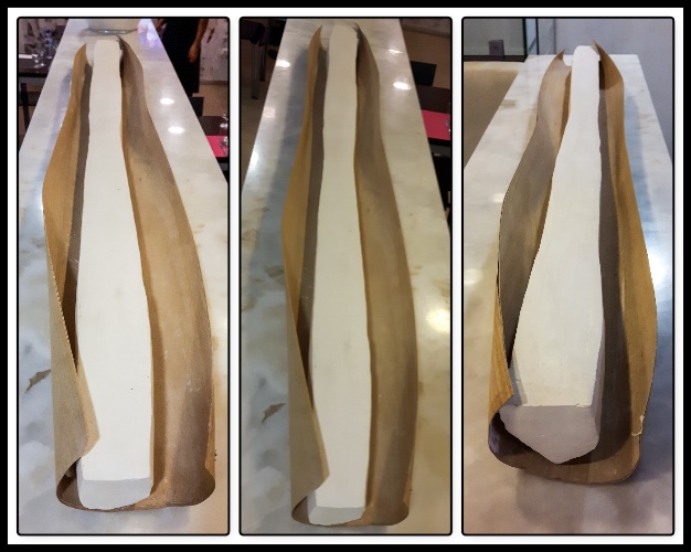 A obra nasce a partir de materiais orgânicos, uma folha e um tronco. Começou a ser elaborada tendo sido dada forma a uma folha de madeira, na sequência da observação do material orgânico recolhido, Dentro da folha e pela sugestão e após contemplação e observação a obra evoluiu para outra dimensão e criei, em gesso, aquilo que viria a ser para mim, o leito dum rio. Para suporte da peça escultórica, elaborei uma base oca em gesso e sisal.