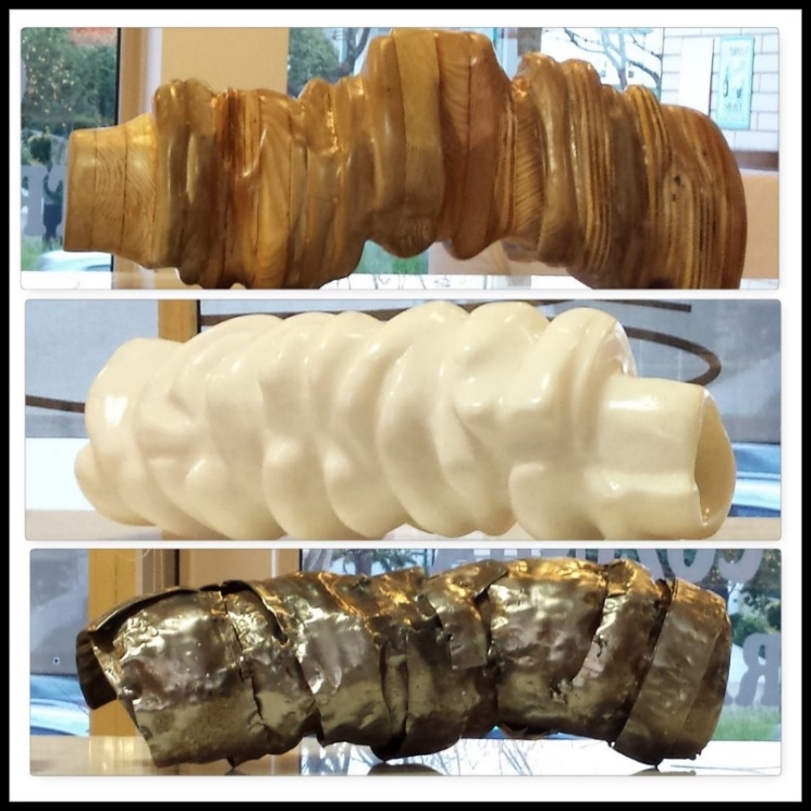 Na minha rotina de trabalho diário, com frequência amaço as garrafas de água de plástico a fim de ocuparem menos espaço no lixo e com a proposta de trabalho escultórico em três materiais diferentes – pedra, ferro e madeira. que me havia sido feita, olhei para a garrafa e veio-me a ideia à cabeça… utilizá-la como modelo base do meu trabalho de escultura! E seria interessante explorar as três matérias a trabalhar. De características tão diferentes, iria assim sentir as dificuldades inerentes ao desenvolvimento do trabalho em cada uma delas, para tentar conseguir um objectivo final que, ao fim e ao cabo, acabava sendo, conceptualmente, idêntico. E a ligação dos três materiais, como se duma evolução temporal se tratasse, pareceu-me interessante.